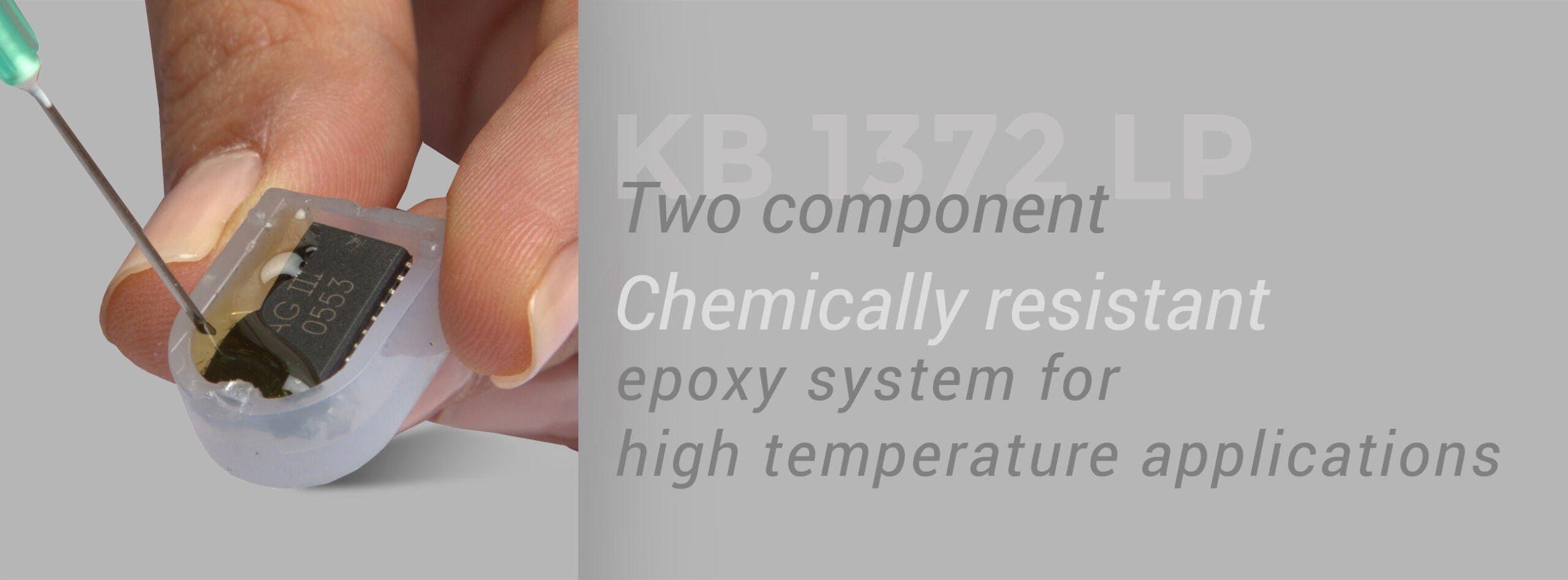 KB 1372 LP is specially formulated for resistance to harsh chemicals. It can hold up to many aggressive chemicals, including water, fuels, oils, solvents, acids and bases. Additionally it is optically clear and cures rigid. This superior adhesive fosters outstanding physical strength and electrical insulation properties. It offers very low shrinkage upon cure and excellent flow properties. KB 1372 LP is widely used in optical, optoelectronic, electronics, fiber-optic and aerospace industries, where optical clarity, low exotherm and chemical and high temperature resistance are key requirements.